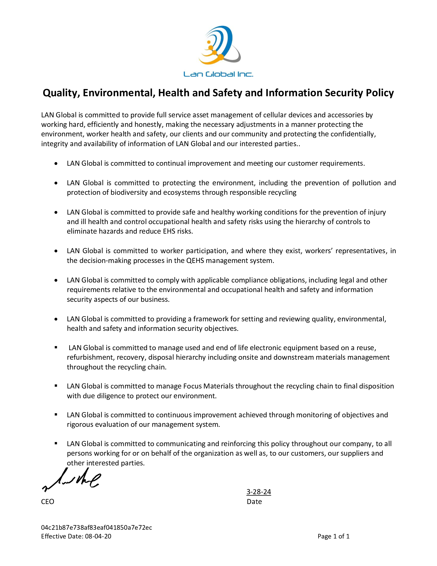 LAN Global is committed to environmental, quality, health and safety management. These values are key components of our company’s standards, which we are continuously improving to meet the changing demands of the industry.